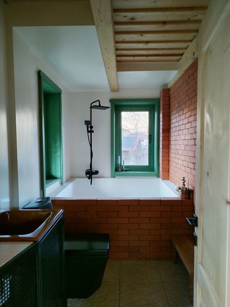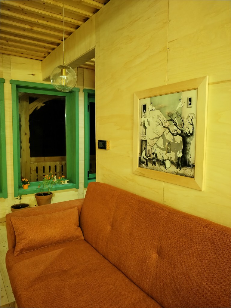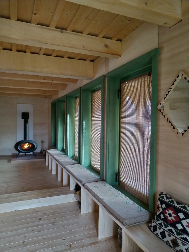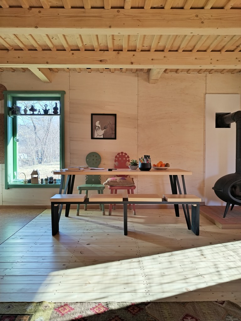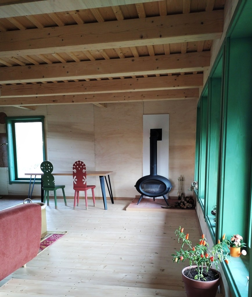 „Ne-am dorit să avem spațiul nostru de zi personalizat unde să ne putem primi toți prietenii”, spune Lucian. „Vrem o bucătărie ieșită din tipar, ca tot interiorul, de altfel. Momentan lucrăm la finisarea locuinței noastre. Casa este izolată complet pe interior cu vată bazaltică, are geamuri și uși, baie funcțională, sobă pe lemne. La mansardă încă nu există pereții care despart camerele. Nu avem încă scara, nici mobilier de bucătărie, bibliotecă, bancă la geam, cuier… Mai sunt multe de făcut, dar e un spațiu călduros în care se poate dormi pe o canapea confortabilă”.