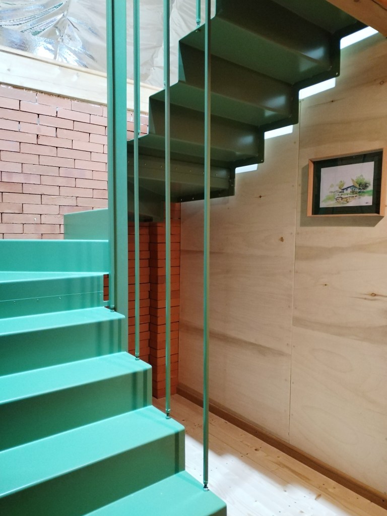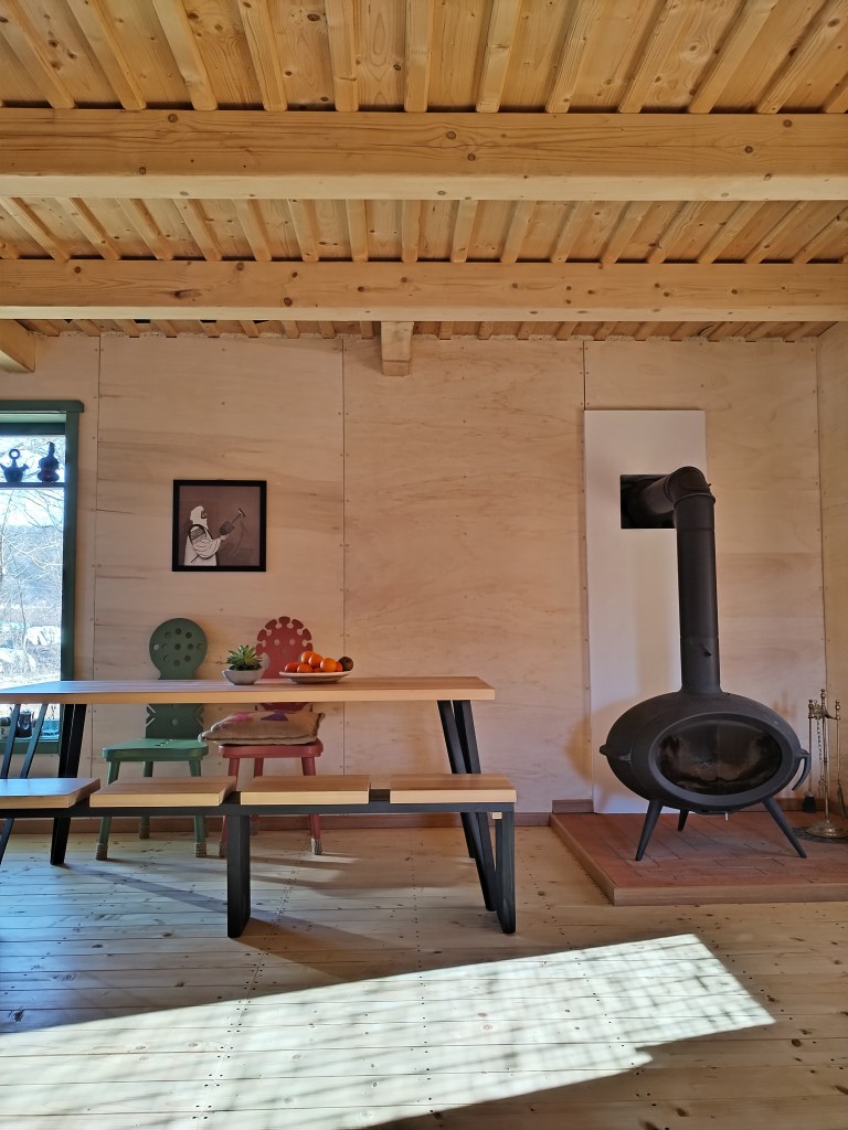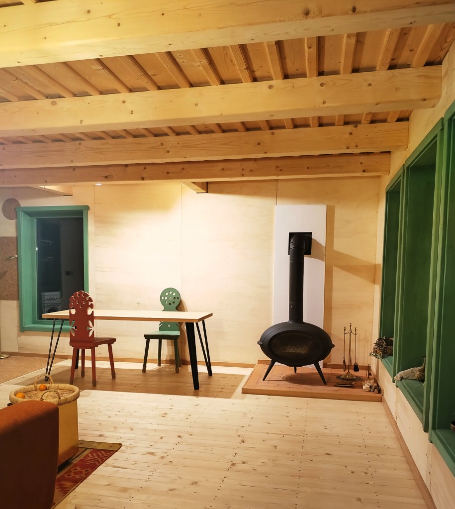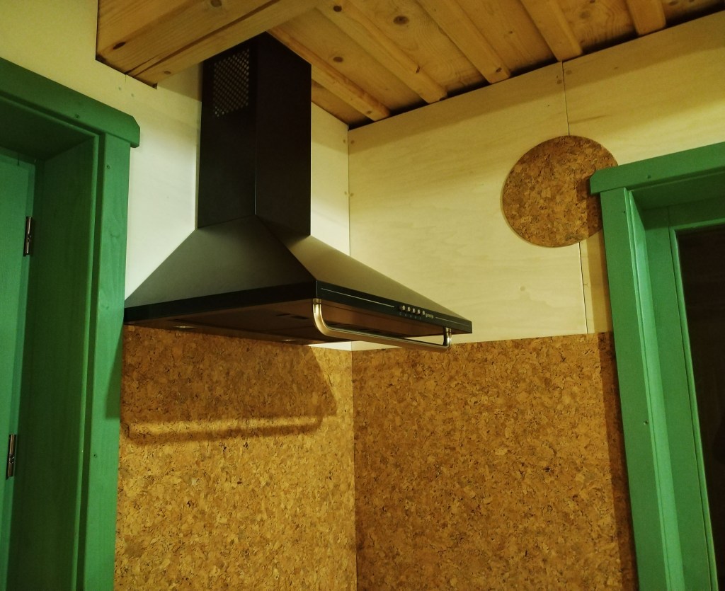 „Ne-am dorit să avem spațiul nostru de zi personalizat unde să ne putem primi toți prietenii”, spune Lucian. „Vrem o bucătărie ieșită din tipar, ca tot interiorul, de altfel. Momentan lucrăm la finisarea locuinței noastre. Casa este izolată complet pe interior cu vată bazaltică, are geamuri și uși, baie funcțională, sobă pe lemne. La mansardă încă nu există pereții care despart camerele. Nu avem încă scara, nici mobilier de bucătărie, bibliotecă, bancă la geam, cuier… Mai sunt multe de făcut, dar e un spațiu călduros în care se poate dormi pe o canapea confortabilă”.