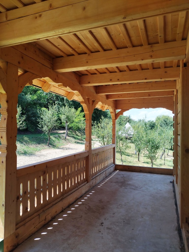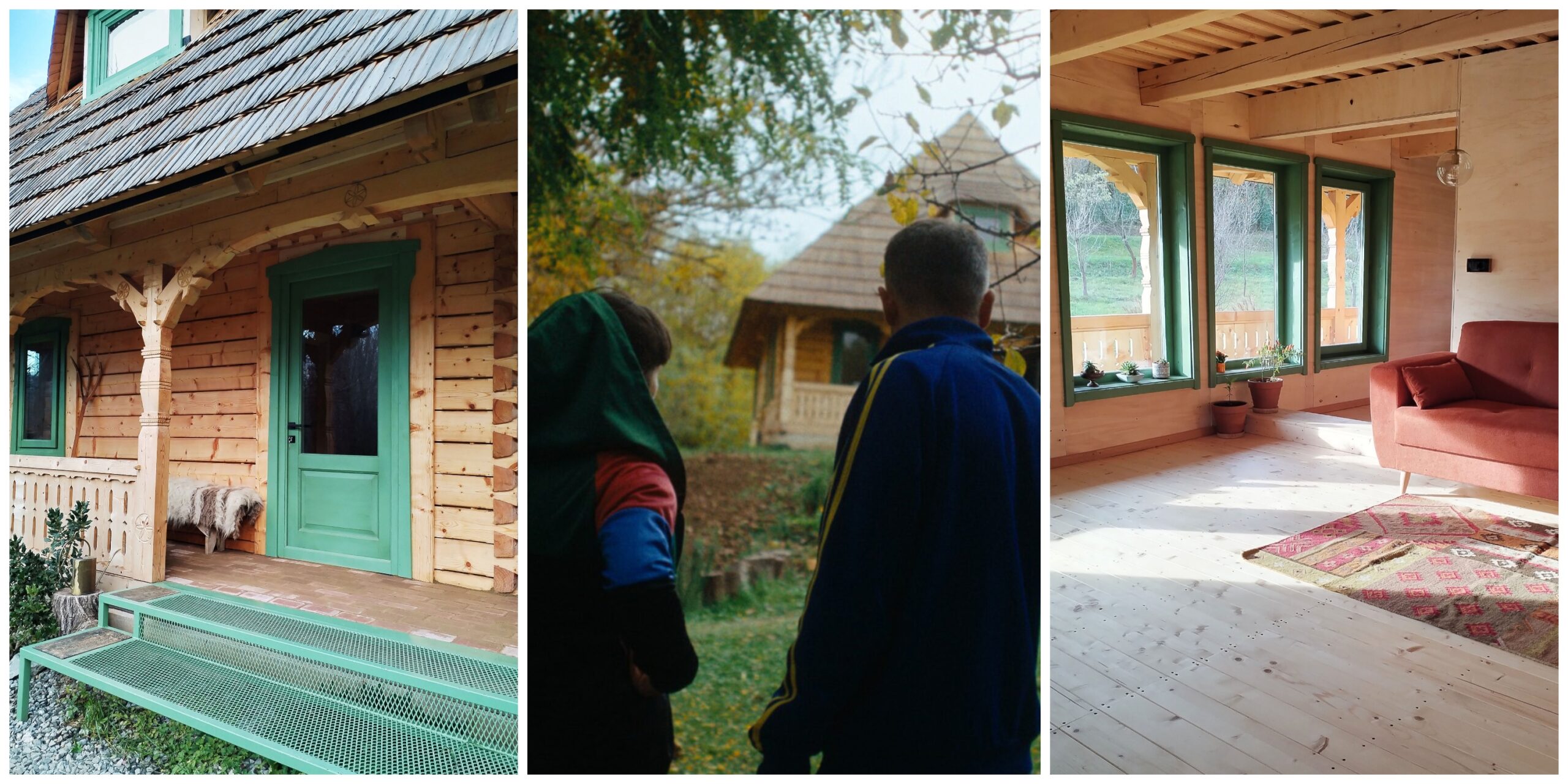 „Am început prin a căuta în zona Apuseni echipe care să construiască locuințe arhaice cu lemn nou, dar fără rezultate”, povestește Lucian. „Am încercat și în regiunea Maramureș, zonă care este localizată în nordul Transilvaniei și care păstrează elemente comune de arhitectură și ornamente. Așa i-am descoperit pe meșterii din Vadu Izei, printre puținii dulgheri autentici din țară încă activi. Ne-am hotărât să construim două astfel de case cu funcțiuni diferite. Structura pentru ambele case a fost ridicată în patru zile, cu lemnul prelucrat și numerotat dinainte. Montajul învelitorii acoperișului a durat încă zece zile”.