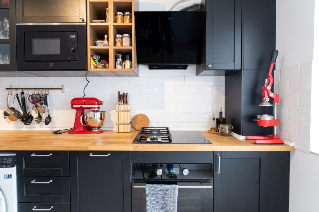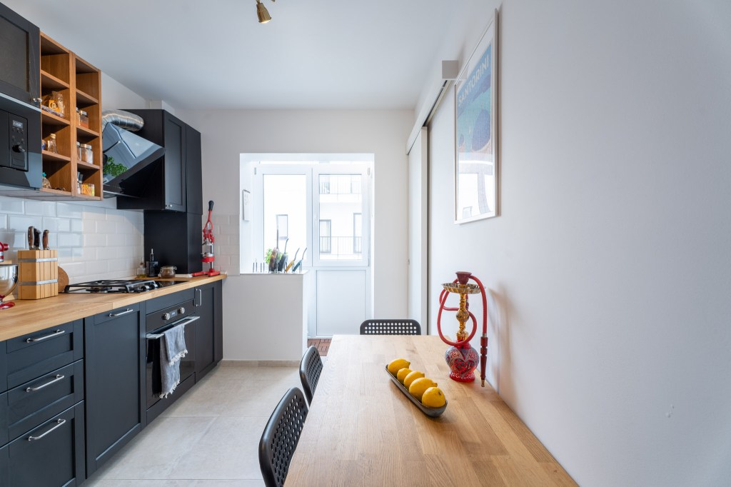 Cei doi proprietari și-au dorit o bucătărie închisă, cu multe spații de depozitare. A fost o zonă dificil de amenajat pentru că instalațiile erau deja montate, iar mobila fusese cumpărată de la Ikea. Posibilitățile de personalizare au fost destul de restrânse, însă cu toate astea, Andreea a reușit să bifeze partea de funcționalitate, fără compromisuri la nivel estetic. Negrul mobilierului este îmblânzit de inserțiile de lemn și finisajele luminoase. Arcada de culoarea teracotei, realizată cu vopsea de tablă în colțul de cafea, amintește de culoarea soarelui la apus.