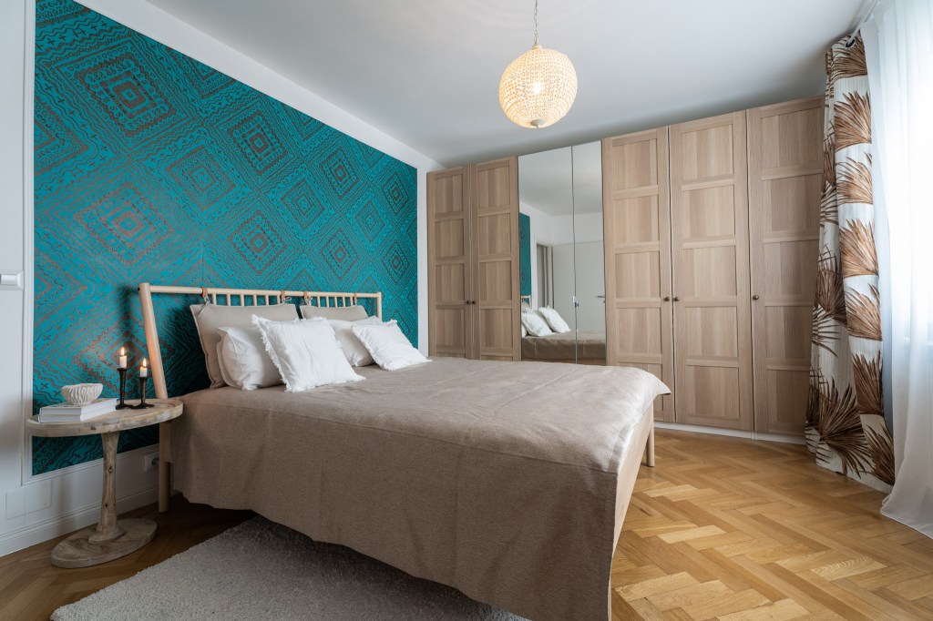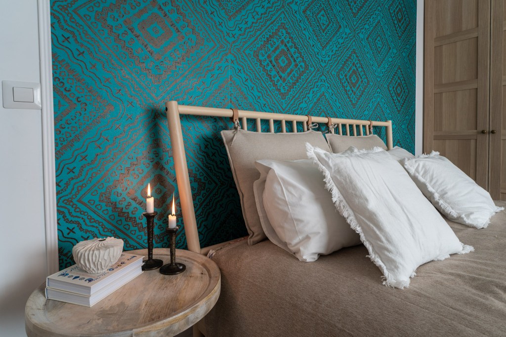 Dormitorul matrimonial este cea mai colorată încăpere a casei. Andreea a ales aici un tapet turcoaz, cu aspect de piele și forme geometrice inspirate din nordul Africii, de culoarea cuprului. Detalii în aceeași culoare regăsim și la draperiile cu frunze luxuriante și la mânerele dulapurilor. Tot cu influențe africane este și suspensia din perle.
