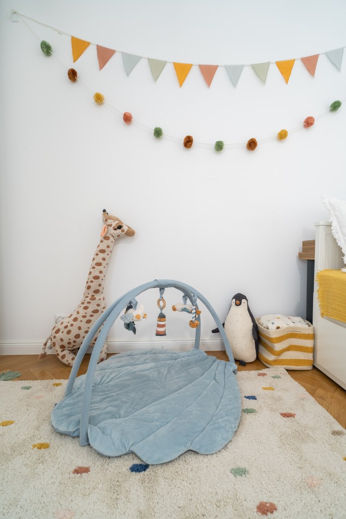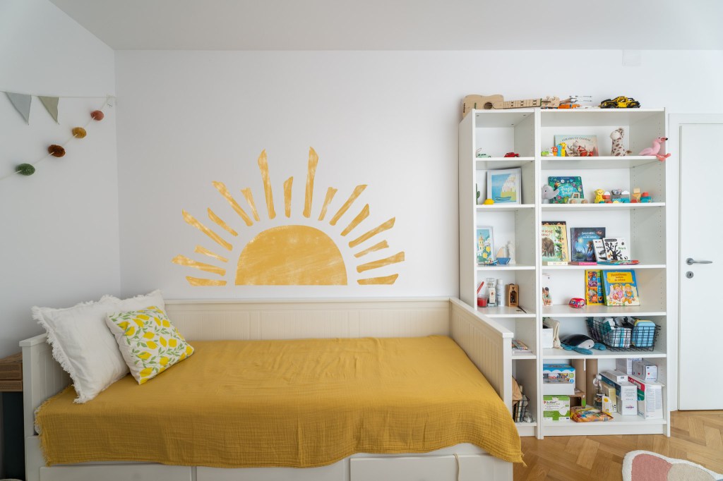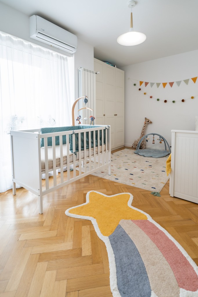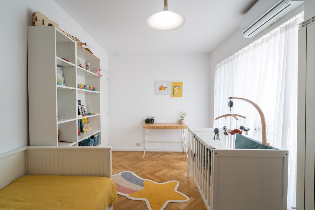 Camera celui mic păstrează tematica de vacanță care a ghidat conceptul de amenajare în tot apartamentul.
