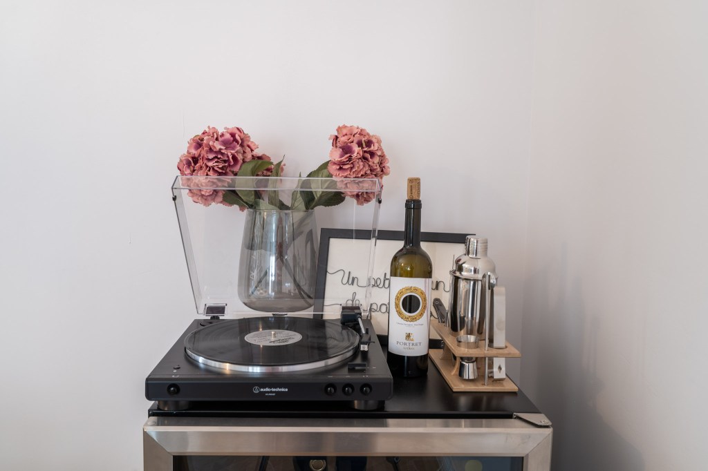 „Dana și Marius iubesc marea și plajele însorite, de aceea am ales un stil cu influențe mediteraneene”, spune Andreea. „Toate pasiunile lor se văd în amenajare. Le place să asculte muzica bună la pick-up-ul din living, în timp ce degustă un pahar cu vin. Este motivul pentru care am și integrat un frigider de vinuri în zona de dining. Au, ca și mine, au pasiune pentru frumos, lucru care se vede în fiecare obiect adus din călătoriile lor în jurul lumii”.