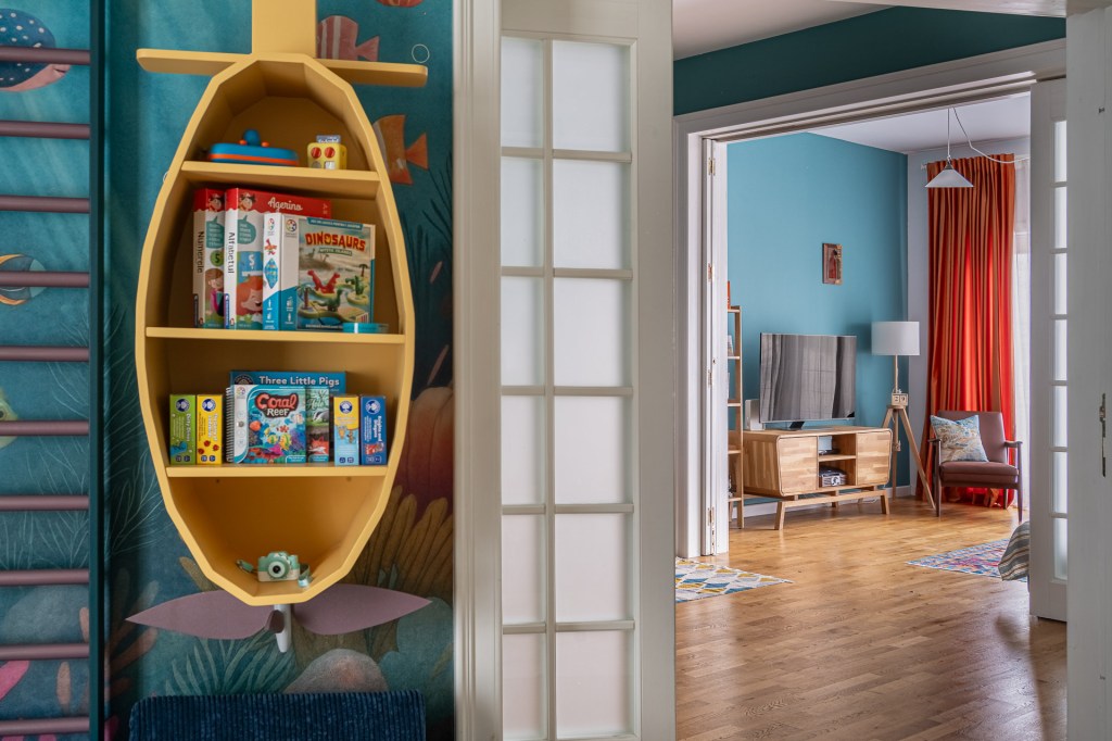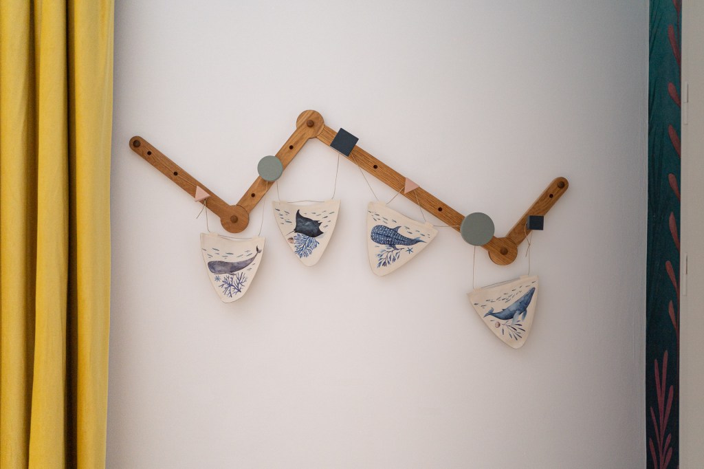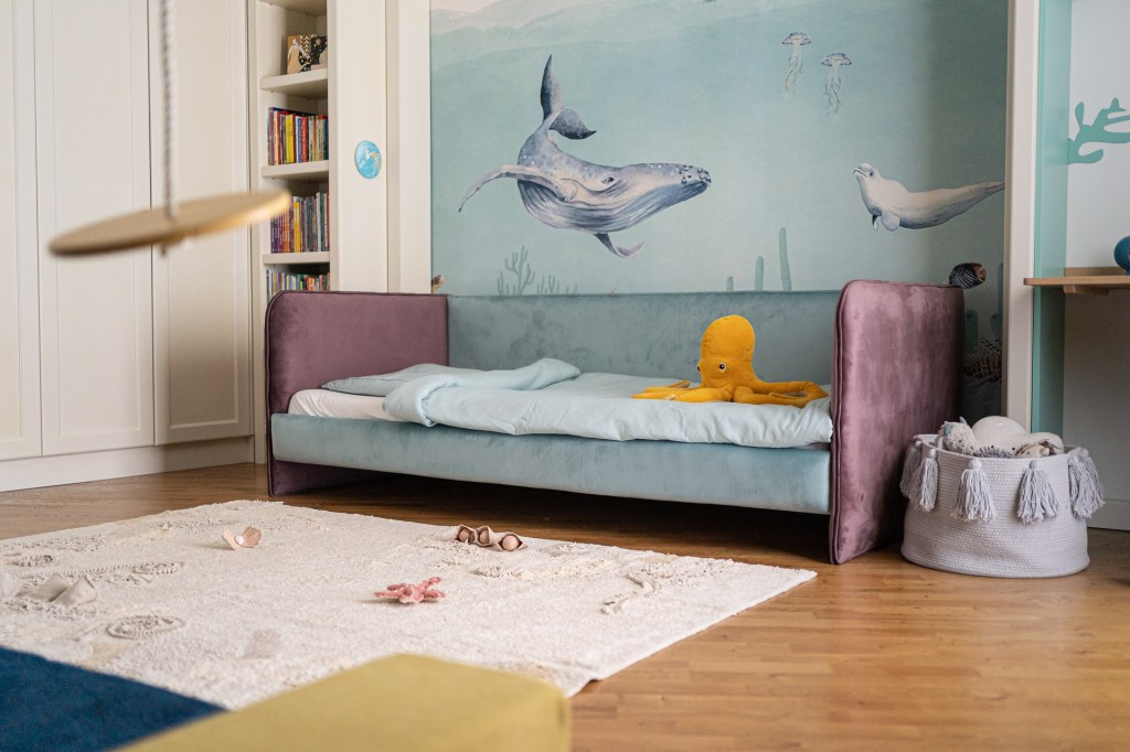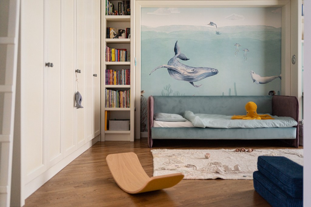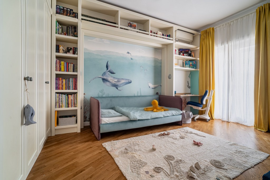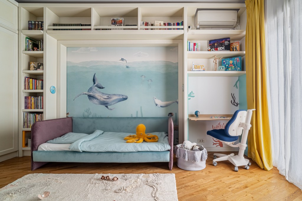 „Băiatul meu are o pasiune pentru mare, piscină, fântâni, cișmele și furtunuri, practic orice legat de apă. Nu aveam cum să alegem altă tematică pentru camera lui”, spune Dana. „Completează minunat restul apartamentului nostru, Vacation Mood, gândit ca o vacanță. Toate deciziile sunt luate împreună. De exemplu, și-a dorit un pat tapițat în două culori, așa că am ales amândoi, cu paletarul în mână nuanțele care se potrivesc cu tapetul de la Walldeco”.