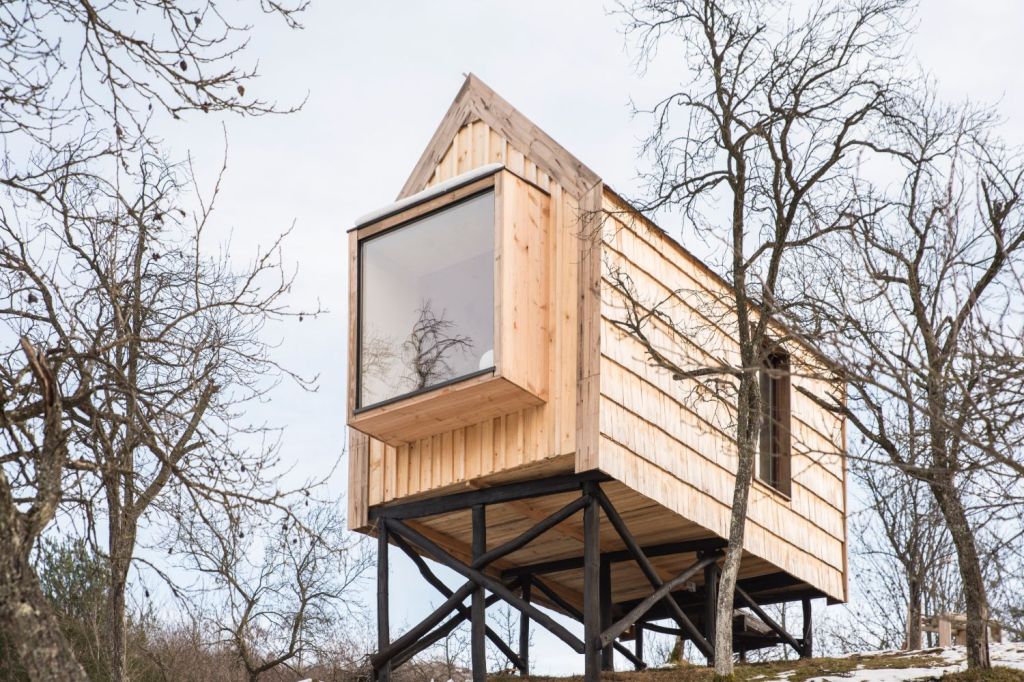 Căsuța a fost proiectată cu un geam imens care să șteargă granițele între interior și exterior. Când stai în pat sau la fereastră, privești deasupra livezii. Pentru oaspeți, această zonă are ceva ce nu întâlnești la tot pasul: zimbri care umblă liberi, ecoturism bazat pe experiențe în natura sălbatică precum observarea faunei, cu păsări, căprioare, mistreți, descoperirea orhideelor sălbatice, expediții pe e-bike, dar și experiențe gastronomice alături de localnici.