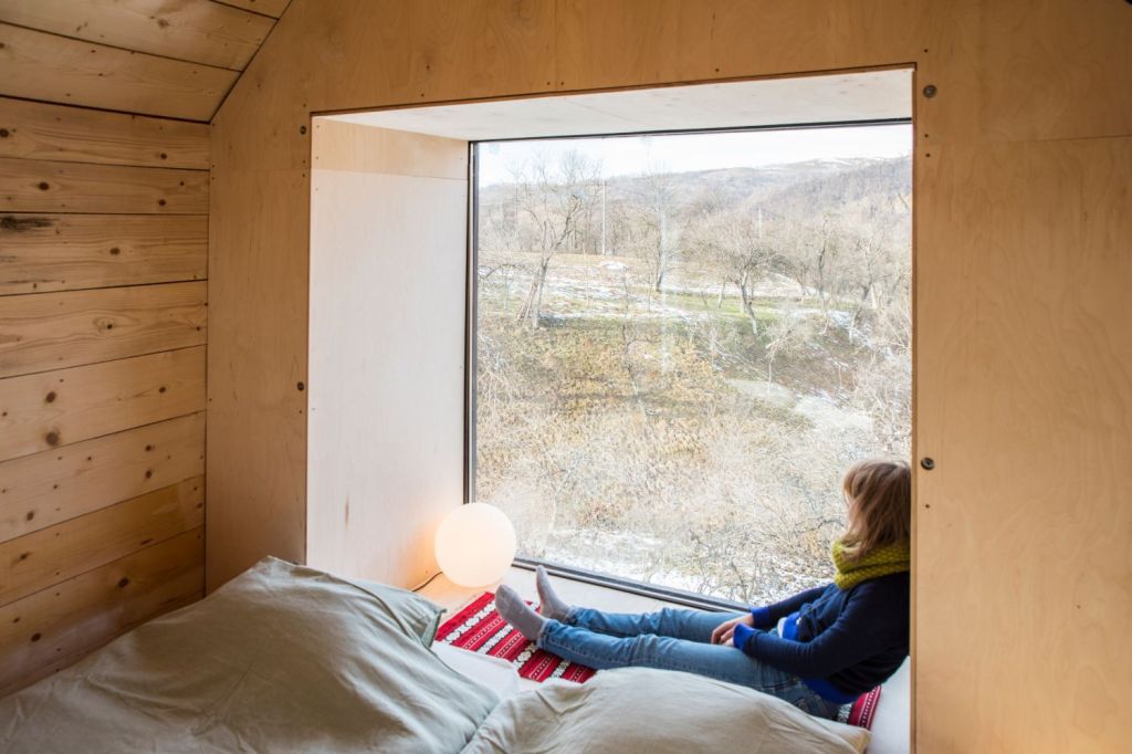 Interiorul căsuței de 16 metri pătrați este minimalist, ocupat în mare parte de pat și de un spațiu unde poți prepara dimineața o cafea, un ceai sau să deguști câteva aperitive locale. Prispa este un loc intermediar între afară și înăuntru, unde te poți adăposti dacă plouă sau e prea soare și unde îți poți da jos încălțările când vii din excursie. Construcția este realizată în întregime din lemn și este izolată contra umezelii și termic, astfel încât poate fi folosită și iarna.