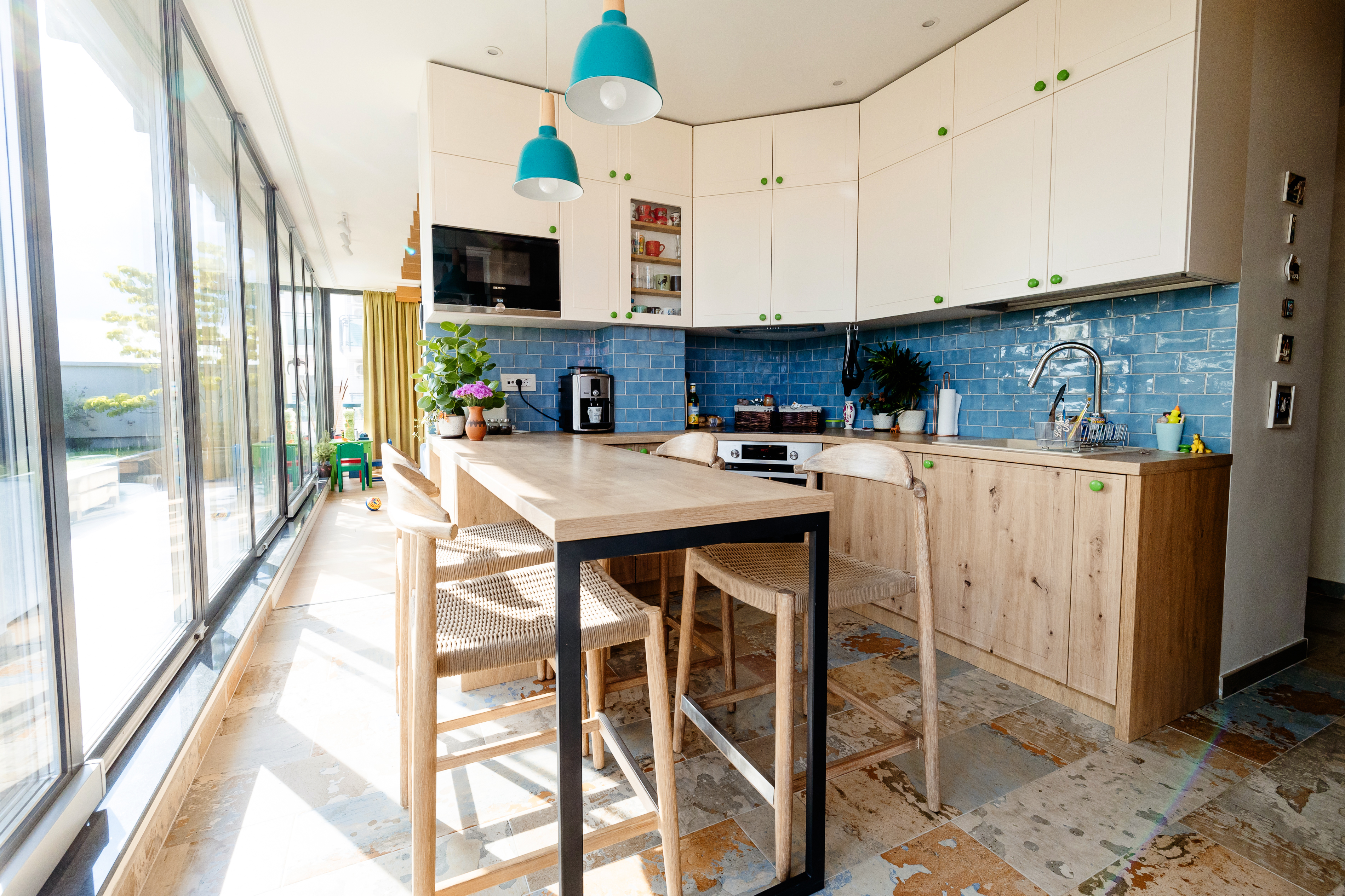 Albastrul, în intensități diferite, a fost culoarea care a dat tonul interiorului unui penthouse din Arad. Interiorul reflectă foarte bine personalitatea proprietarilor, doi tineri pasionați de călătorii, artă și sporturi acvatice. Pentru că beneficiarii sunt și părinți, decorul a integrat multe elemente jucăușe, care să se adapteze personalității micului lor explorator. Unul dintre punctele forte ale apartamentului este terasa de 90 metri pătrați, gândită ca un fel de curte „la înălțime”, cu zonă de lounge, grătar și multă verdeață.