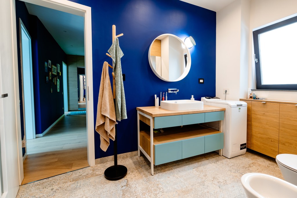 Albastrul, în intensități diferite, a fost culoarea care a dat tonul interiorului unui penthouse din Arad. Interiorul reflectă foarte bine personalitatea proprietarilor, doi tineri pasionați de călătorii, artă și sporturi acvatice. Pentru că beneficiarii sunt și părinți, decorul a integrat multe elemente jucăușe, care să se adapteze personalității micului lor explorator. Unul dintre punctele forte ale apartamentului este terasa de 90 metri pătrați, gândită ca un fel de curte „la înălțime”, cu zonă de lounge, grătar și multă verdeață.