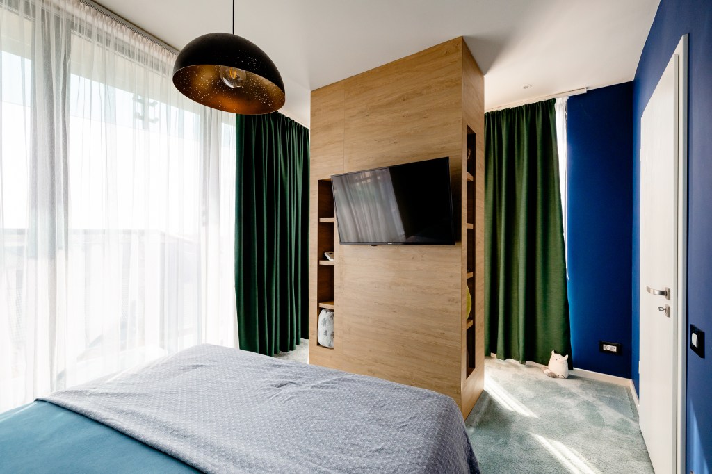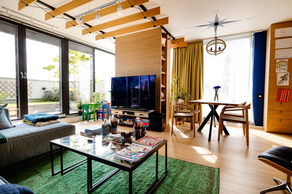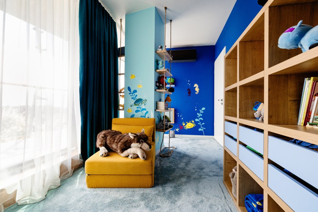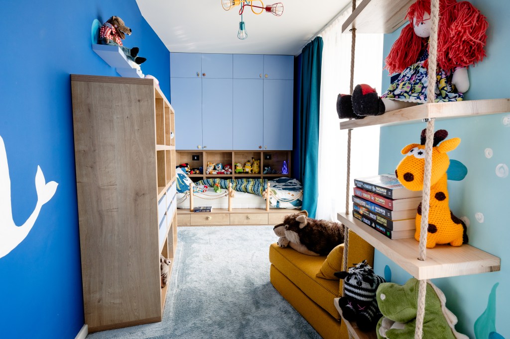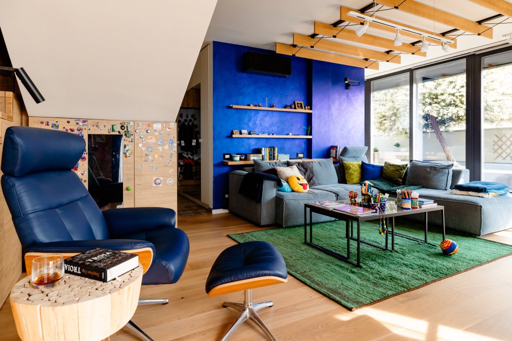 Un penthouse din Arad îmbină tonuri variate de albastru, un spațiu de joacă dedicat copilului și o terasă cât o curte