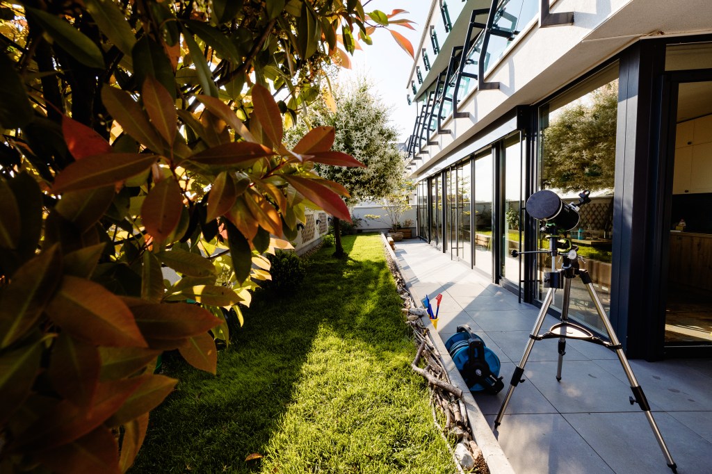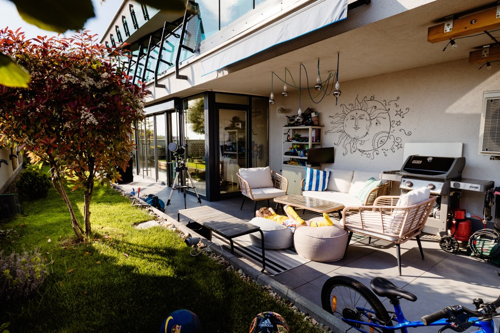Terasa penthouse-ului este un fel de prelungire a zonei de zi. Are spații verzi, zonă de lounge și grătar. Mobilierul este confortabil și prevăzut cu soluții de umbrire, absolut necesare în zilele foarte călduroase. Privind din bucătărie, pare mai degrabă curtea unei case. Pentru alegerea plantelor, Cristina s-a consultat cu peisagista Rebeca Bedelean.