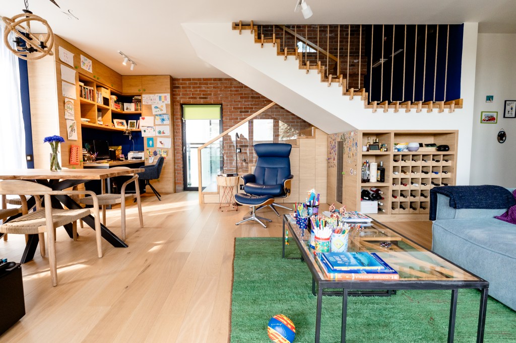 „Am încercat să creez un echilibru între preferințele estetice ale beneficiarilor și nevoile lor funcționale. Proprietarii și-au dorit un spațiu creativ și relaxant, care să includă și nevoile băiețelului lor, Eric. O astfel de zonă care hrănește curiozitatea celui mic este locul de joacă de sub scară, un mic univers, colorat și magic”, spune Cristina.
