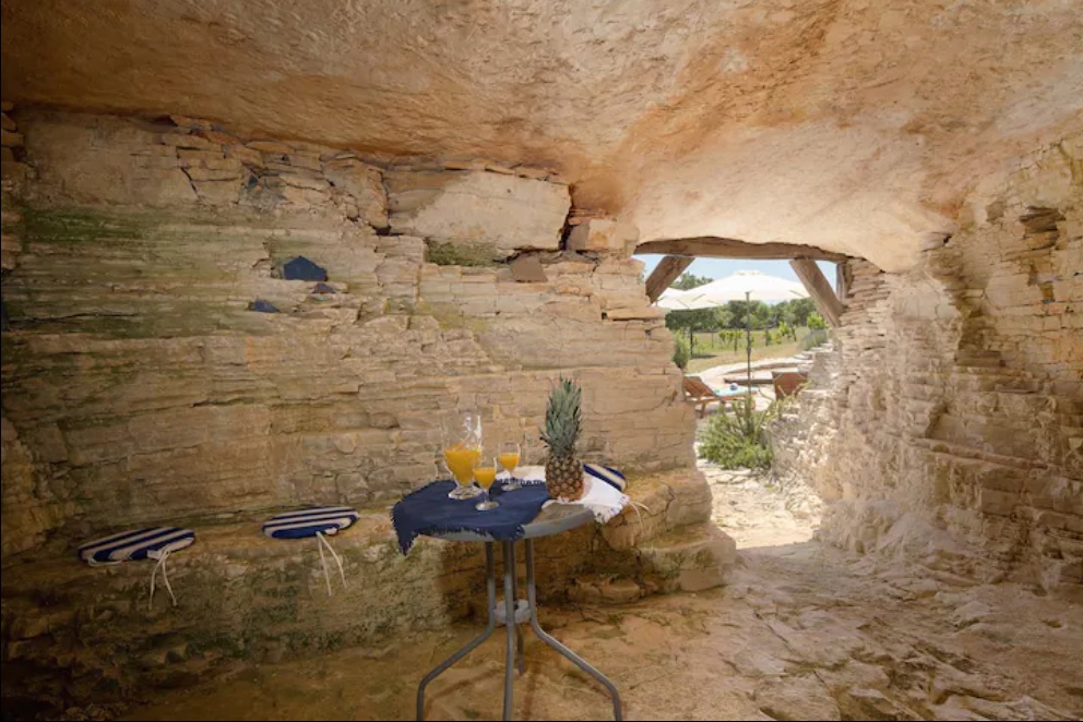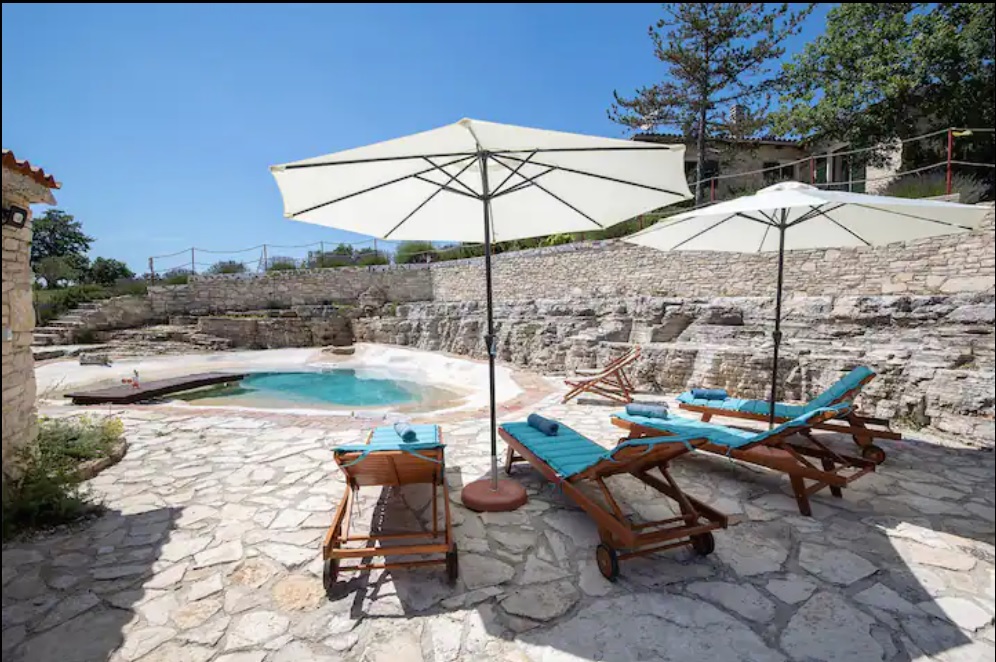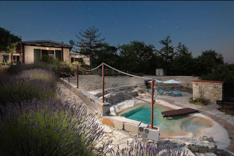 Vila Eternă are trei dormitoare, pretabilă pentru șase oaspeți, se află în localitatea Jursici, între orașele medievale Svetvincenat și Vodnjan, și oferă o piscină privată și o curte spațioasă de 10.000 metri pătrați. Ca să-ți faci o idee mai clară, cazarea se află la 20 kilometri de Pula, iar oaspeții beneficiază de un loc mirific și retras, în mijlocul naturii. Fiecare dormitor are baie proprie, iar bucătăria e dotată cu toate cele necesare unui sejur. Pe mine, însă, m-a atras acea piscină cu arhitectură cel puțin inedită, săpată în piatră.