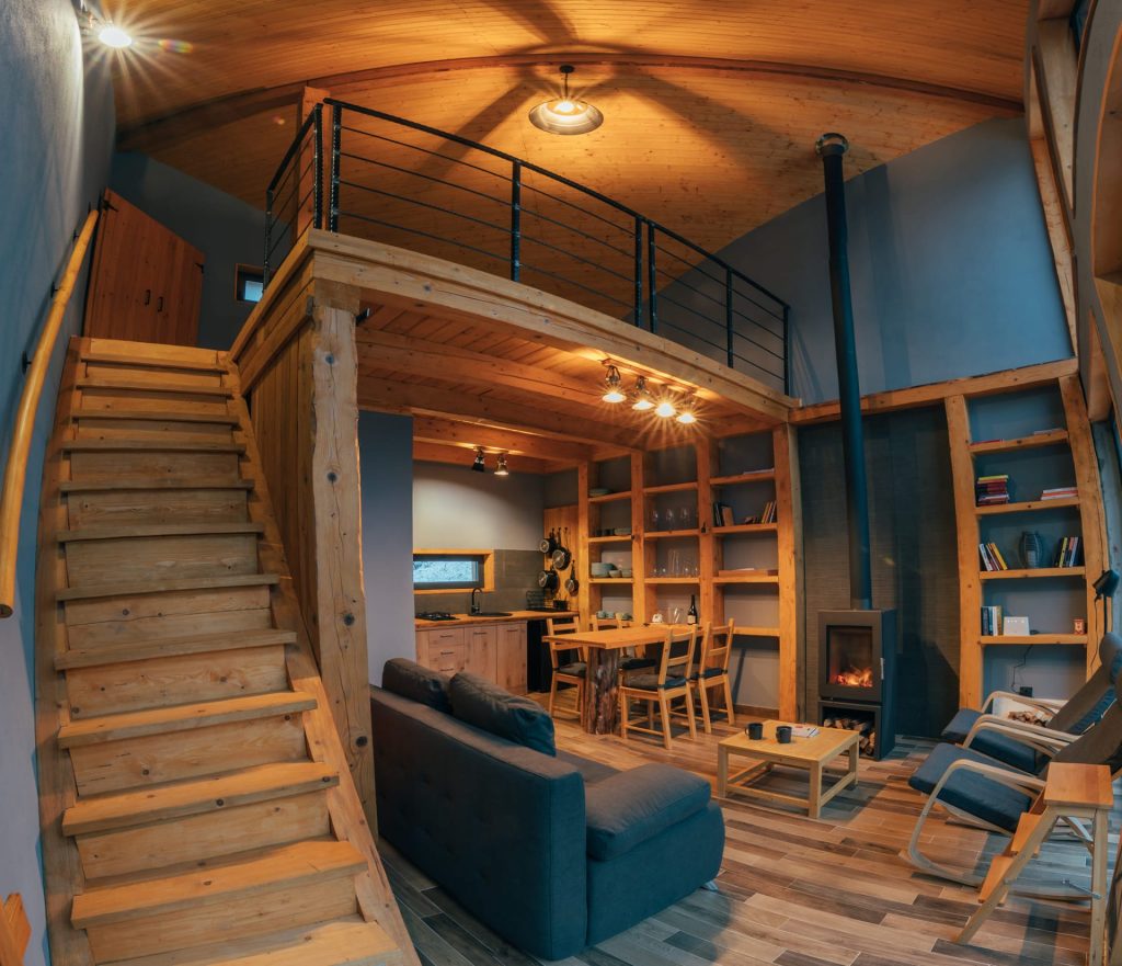 Fiecare cabană are o panorama superbă, în zona declarată cu cel mai curat aer din România, terasă și curte privată. Situate pe două niveluri, cabanele Forest, Blue și Panorama au jos un living cu o canapea extensibilă pentru două persoane, o baie și o bucătărie complet utilată. În partea de sus, se află un dormitor care comunică cu livingul printr-o scară interioară.