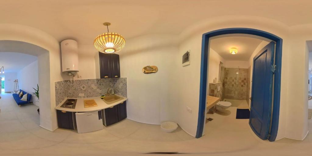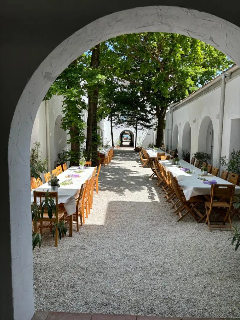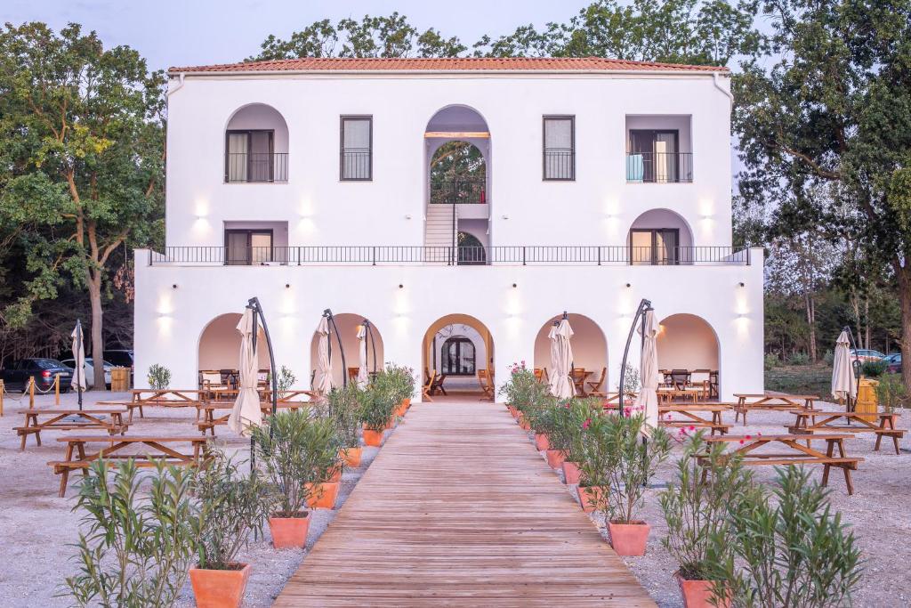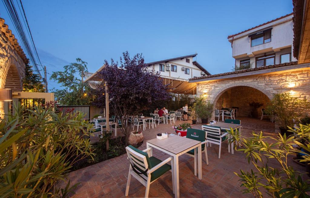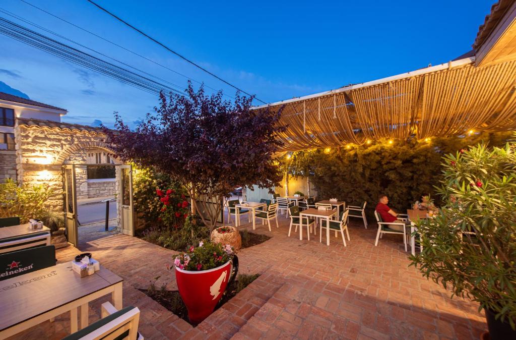 Micul dejun, prânzul sau cina pot fi servite chiar pe terasa cazării, una cu un decor deosebit, cu multă piatră și umbrită de leandri și de alți arbuști exotici, care te duce cu gândul la riviera grecească sau italiană.