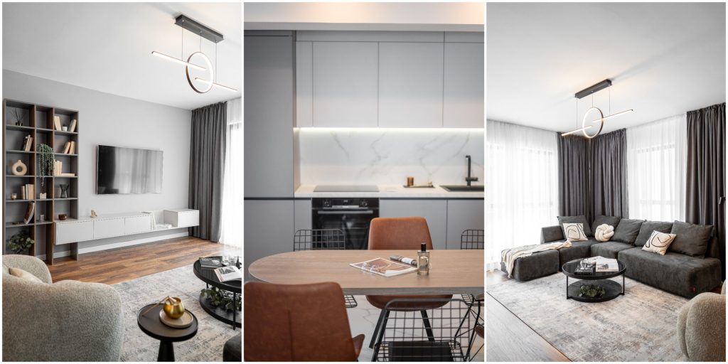 - Bucătării open space: permit separarea zonei de gătit de living și oferă flexibilitate în utilizarea spațiului;