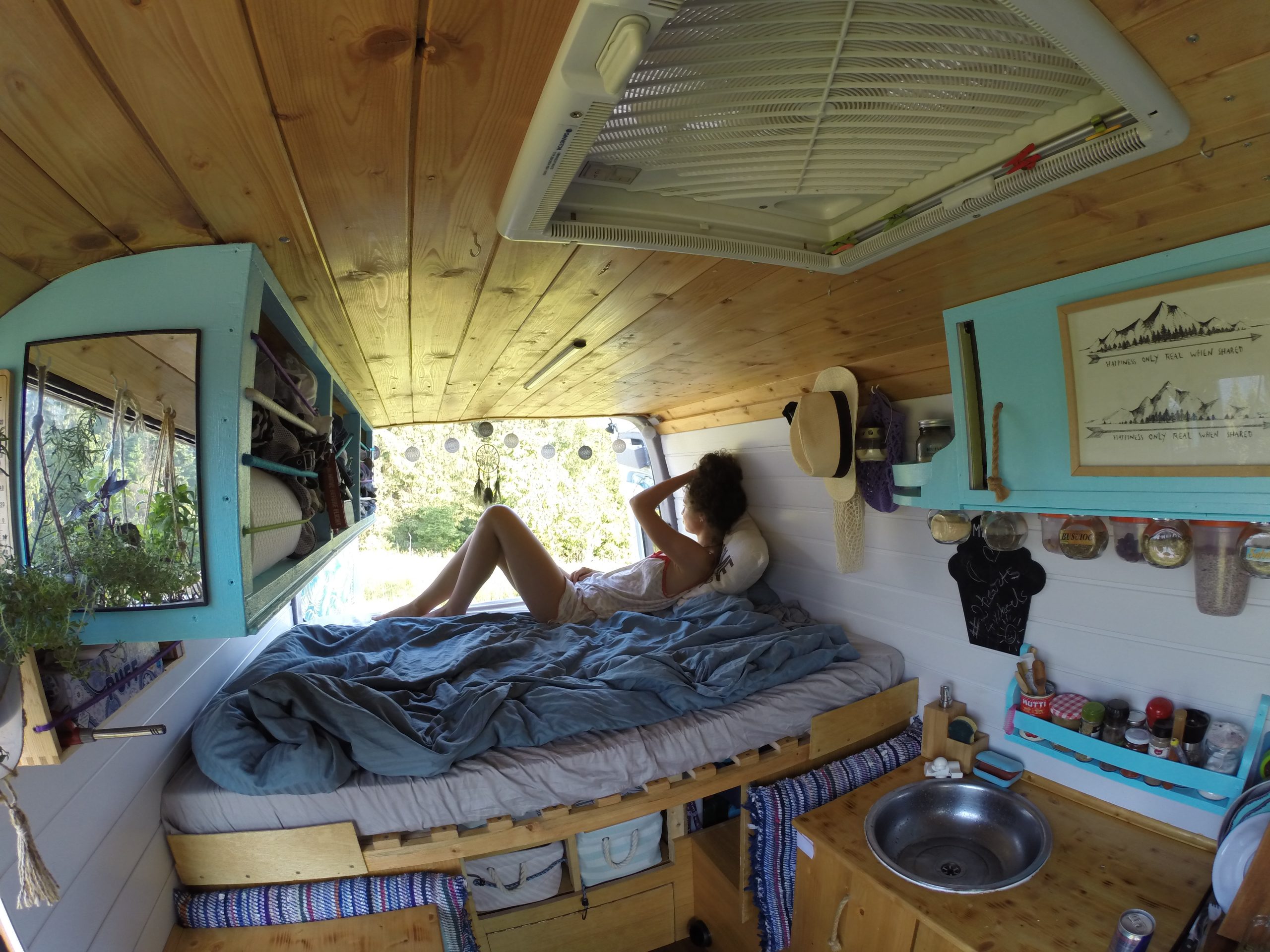 Baia este mobilă, adică improvizează o cabină de duș în mijlocul mașinii; au un portbagaj spațios în care încap două biciclete, trusa cu scule, bateriile și sistemul de căldură pe care l-au adăugat anul acesta. Autorulota este dotată cu panouri solare, iar aragazul funcționează cu o butelie cumpărată din Anglia.