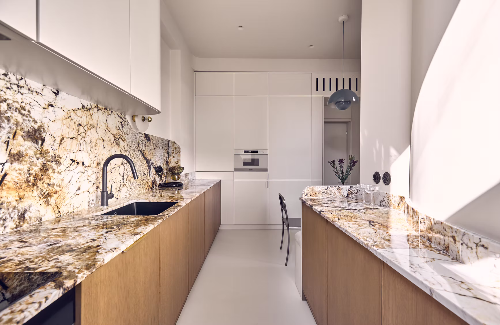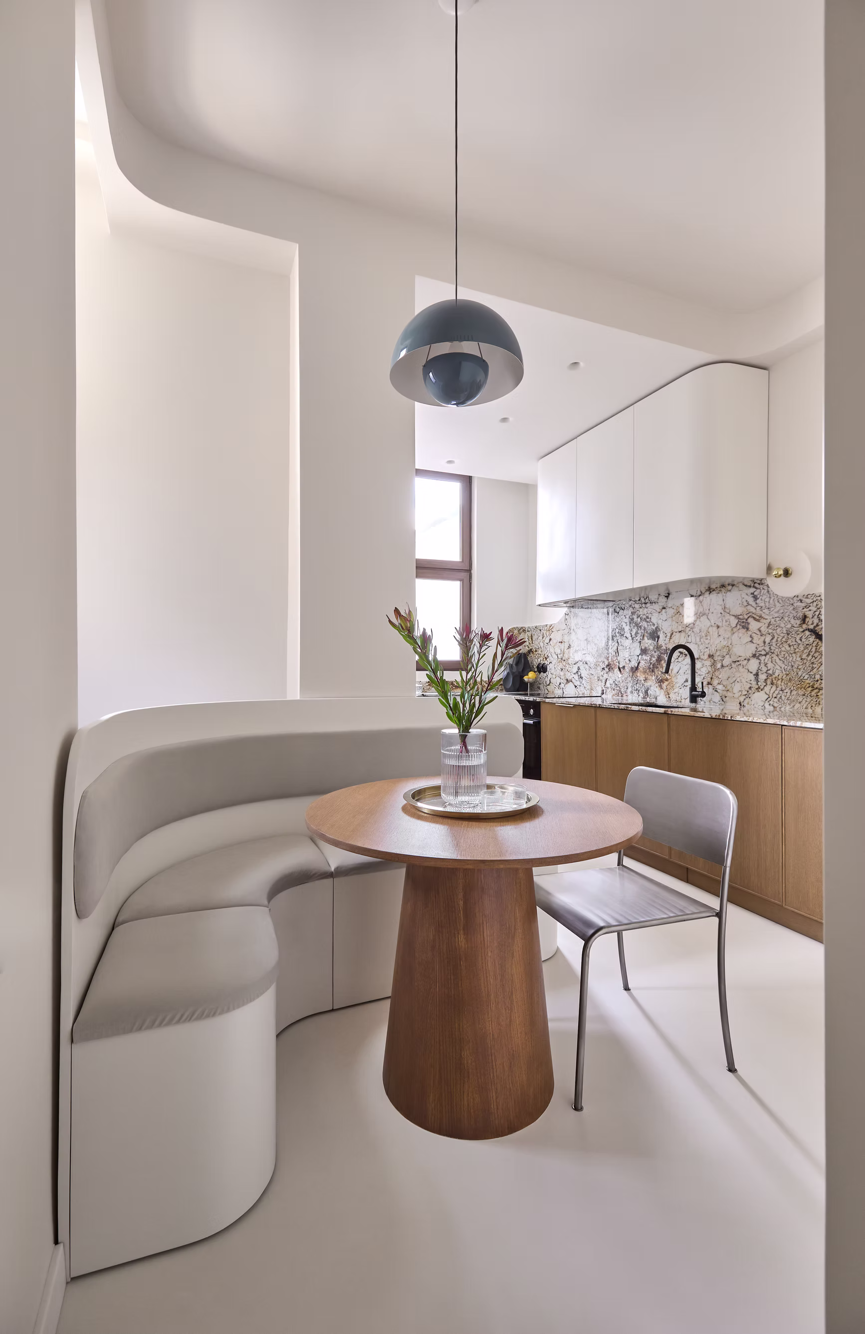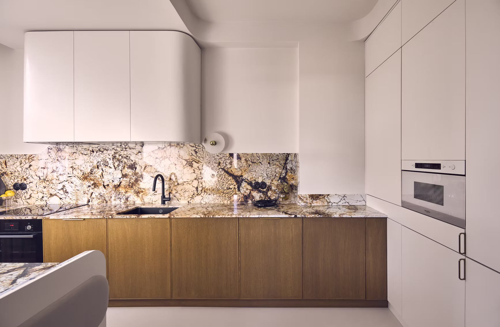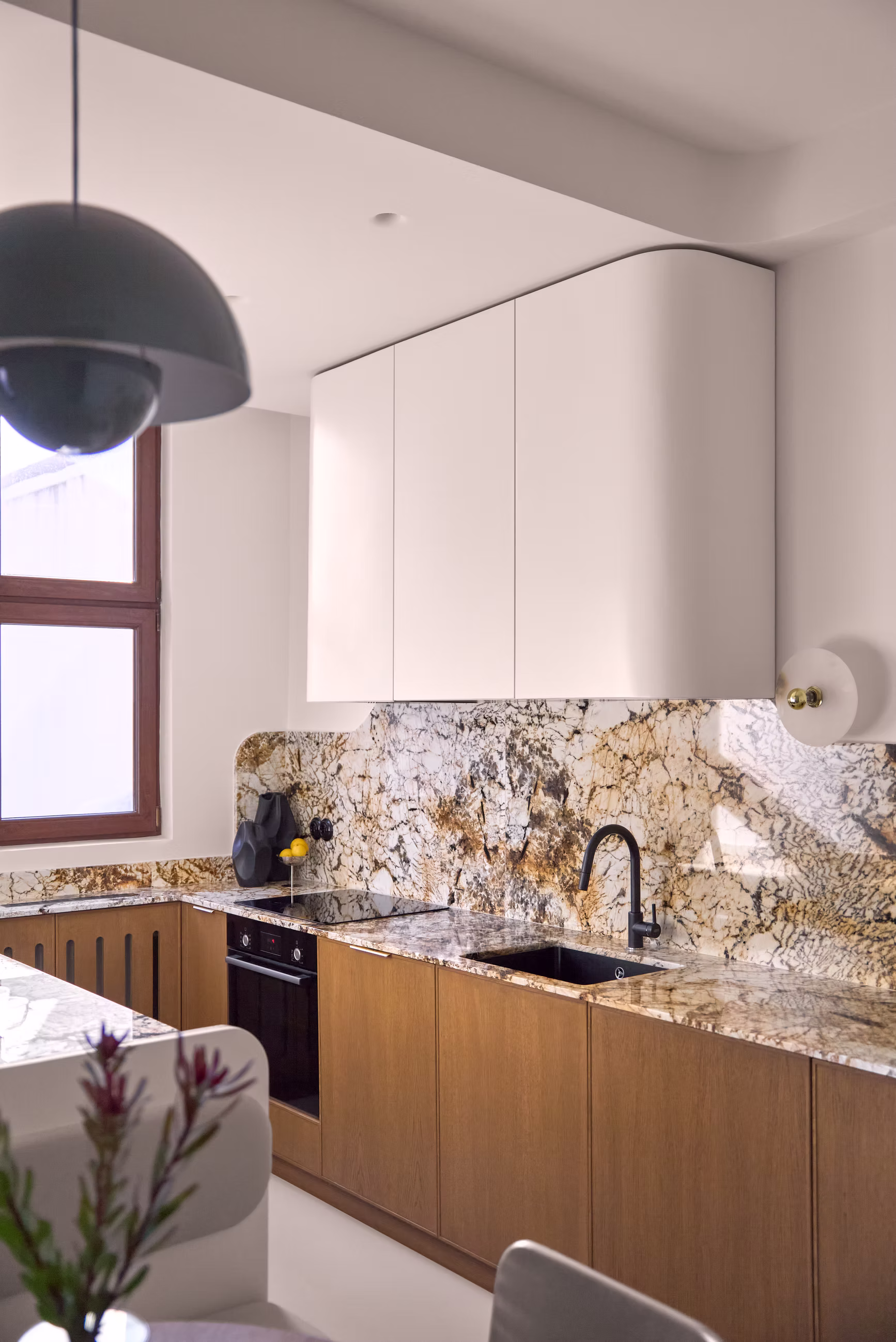 Bucătăria este încăperea în care Andra se regăsește cel mai mult ca designer de interior. „Este caracterizată prin multe curbe, spații fluide care se continuă fără întrerupere, generând un tot unitar.” Și aici, a gândit amenajarea „în cadre”: primul este zona de masă cu băncuță, care invită la explorarea restului bucătăriei, unde formele devin mai geometrice și mai dinamice. Materialele naturale au fost esențiale. A combinat lemnul cu o lastră de piatră naturală cu desen aparte, pe care a ales-o din prima clipă în care a văzut-o, pentru modul în care poate scoate în evidență restul elementelor spațiului.