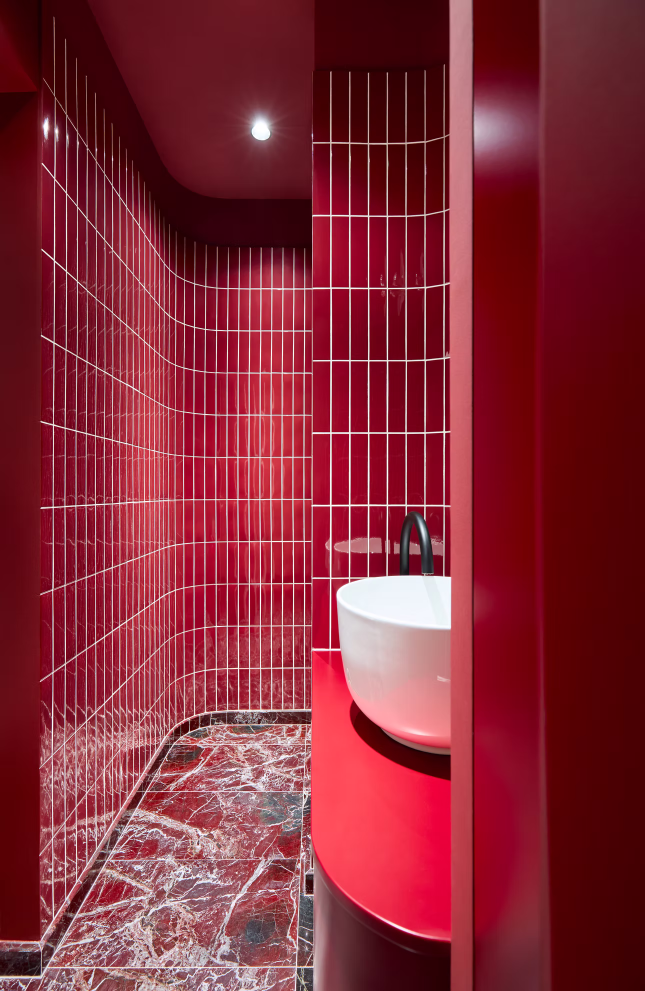 Dar spațiul care m-a inspirat și care m-a făcut să mă întreb unde și cum aș putea adapta stilul și în casa mea este, în mod paradoxal, baia de serviciu. O încăpere foarte mică, cu toaletă și duș, unde arhitecta a mizat pe o atmosferă intimă și puternică. A vopsit pereții în într-o nuanță burgundy, aceeași nuanță în care a ales și gresia cu care a îmbrăcat zonele rotunjite ale dușului.