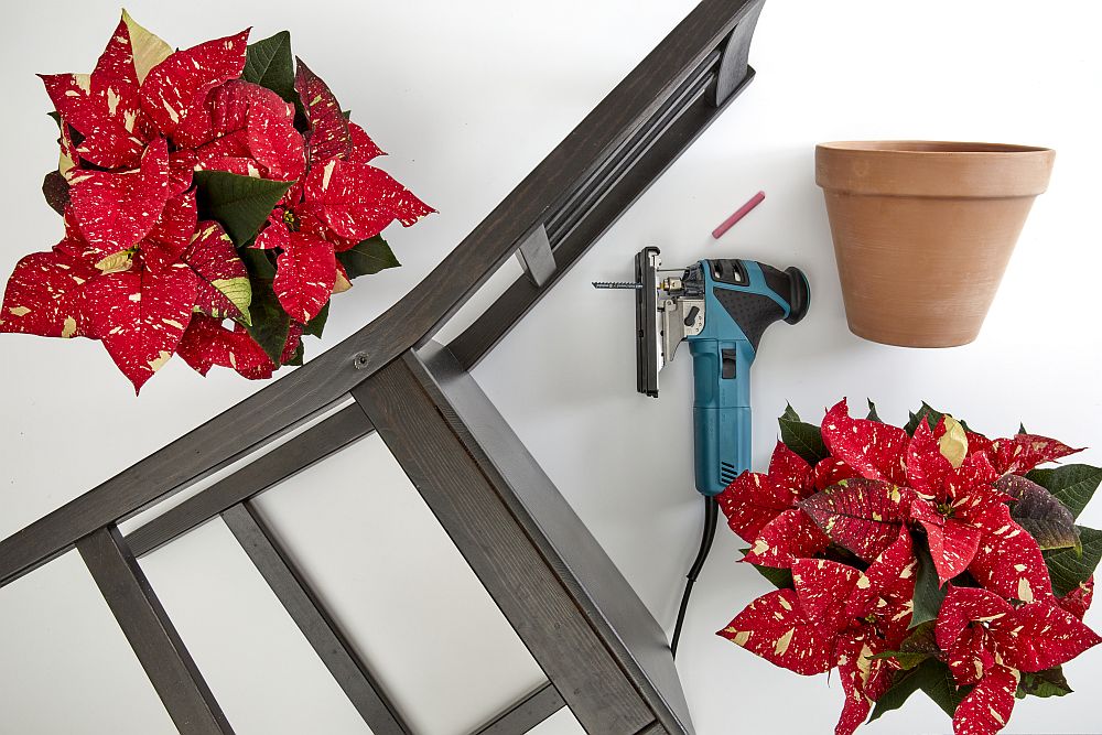 Dacă ai chef de un proiect de upcycling, transformă niște scaune vechi în suporturi pentru plante. Vei avea nevoie de un scaun vechi de lemn, un fierăstrău, cretă, un vas de teracotă și o Crăciuniță mare.