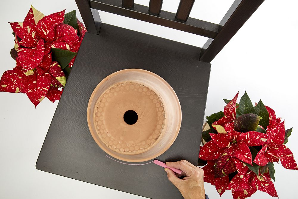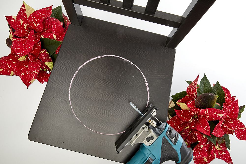 Instrucțiuni: desenează cu cretă un cerc pe scaun, asigurându-te că diametrul acestuia este mai mic decât cel al vasului de teracotă. Taie cercul cu un fierăstrău. Pune vasul de teracotă în gaură și plantează Crăciunița în el.