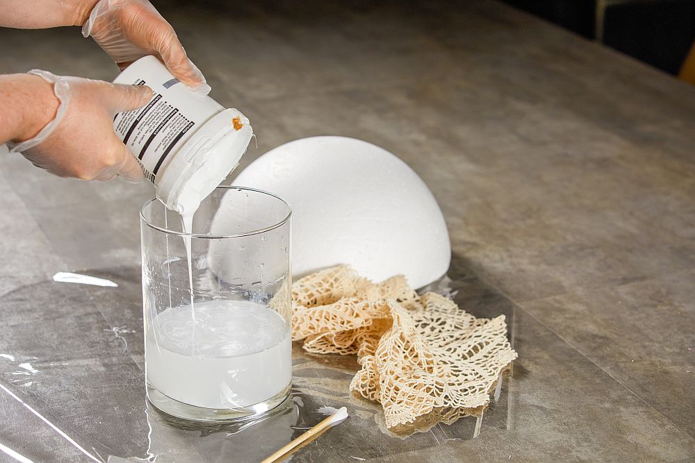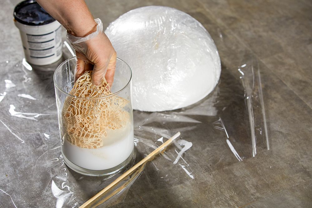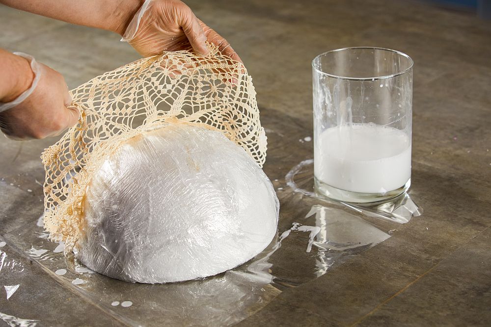 Pasul 2: înfășoară cu grijă semisfera de polistiren sau jardiniera cu folie alimentară. Înmoaie mileurile de dantelă în amestecul de lipici și apă.