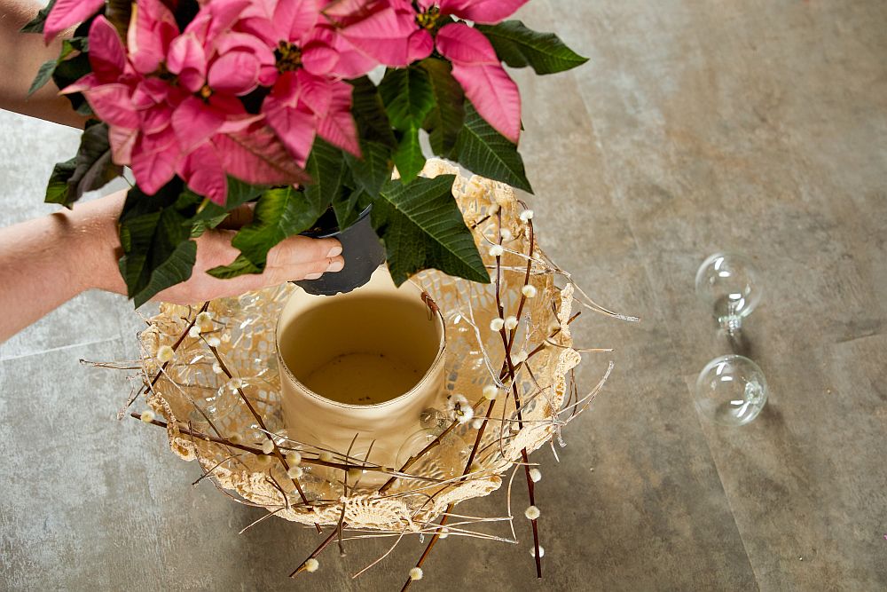 Pasul 4: așază jardiniera în bolul de dantelă. Umple spațiul dintre jardinieră și marginea vasului cu globuri de sticlă și decorează cu crenguțe de salcie și ace de pin. La final, pune Crăciunița în jardinieră. Sfat: în loc de globuri de sticlă, o instalație de lumini poate umple spațiul.